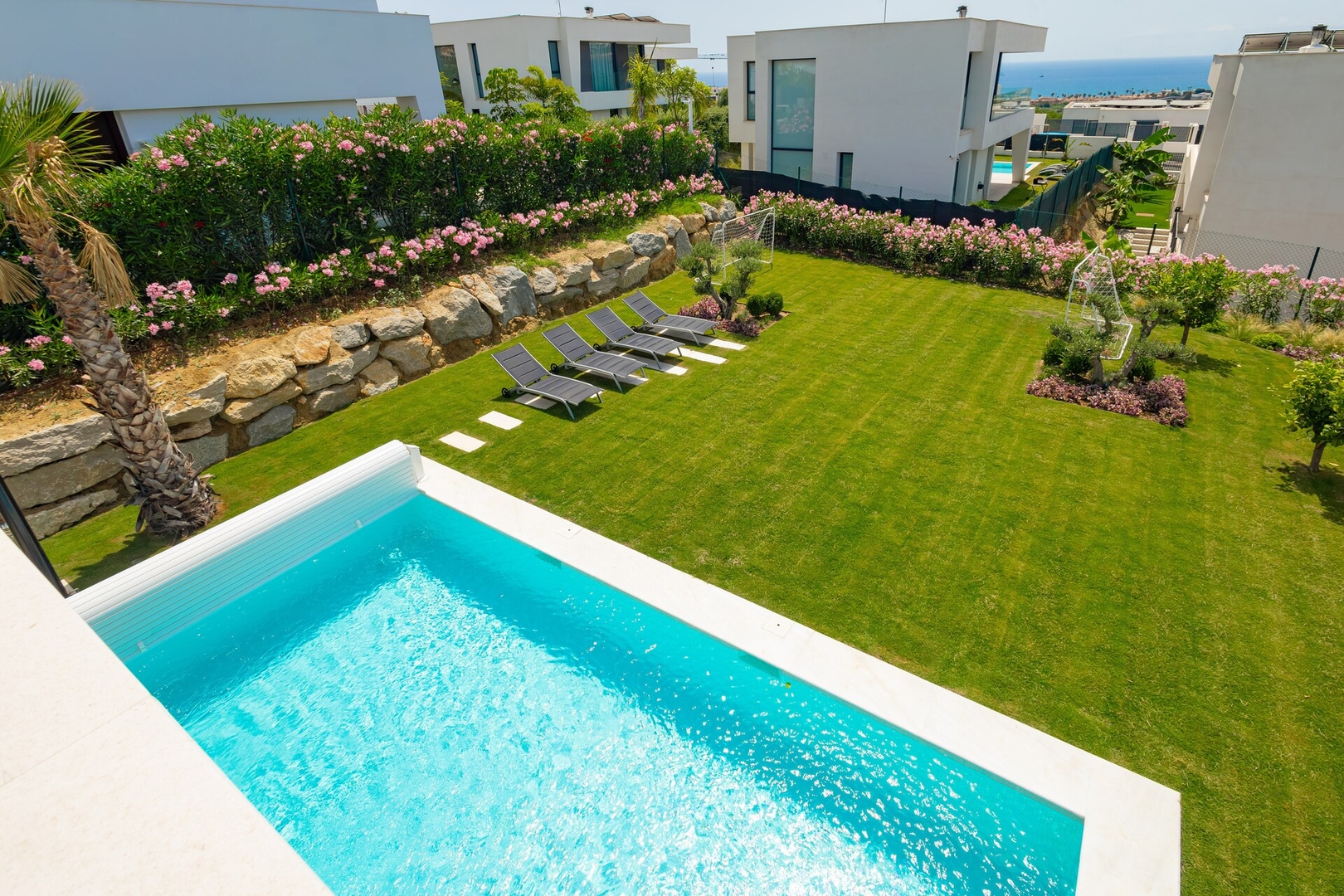 A private swimming pool surrounded by loungers and sea views