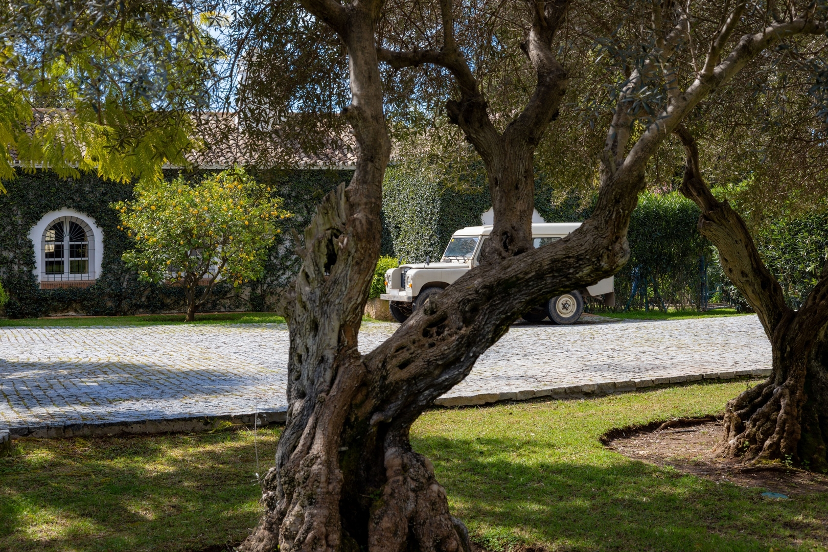 The villa is set in the middle of a flat 7,000 m² landscaped garden and accessed through a large circular driveway. Inside, a spacious entrance hall leads to a comfortable living room with wooden beam ceilings and a fireplace, a dining room, and a fully equipped kitchen.